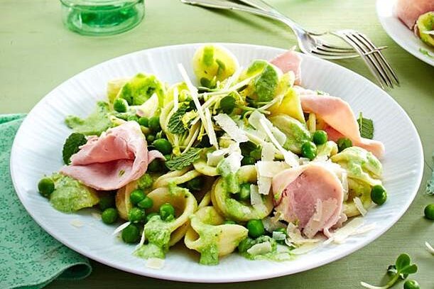 Frühlingspasta mit Erbsen & Schinken (ganz einfach) Zubereitungszeit: 25 Minuten Rezept für 4 Personen Zutaten 200 g tiefgefrorene Erbsen 400 g Nudeln (z. B. Orecchiette) Salz & Pfeffer 5–6 Stiel(e) Minze 150 g Ricottakäse 1–2 EL Zitronensaft 1/4 Beet Kresse 25 g Spargelsprossen (falls vorhanden) 50 g Parmesankäse 75 g gekochter Schinken in dünnen…